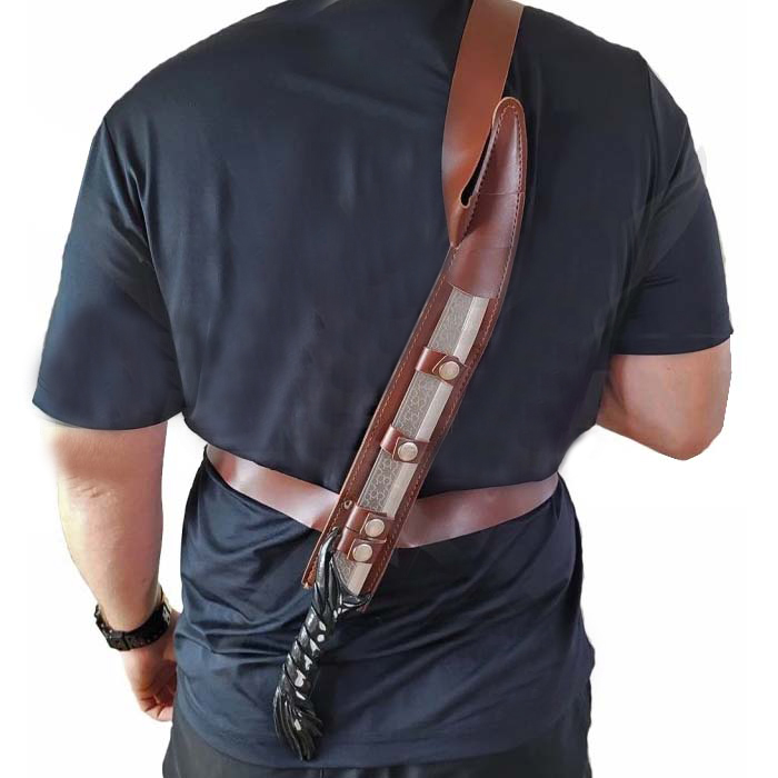 • Fourreau dorsal en simili cuir marron avec sangle ajustable.