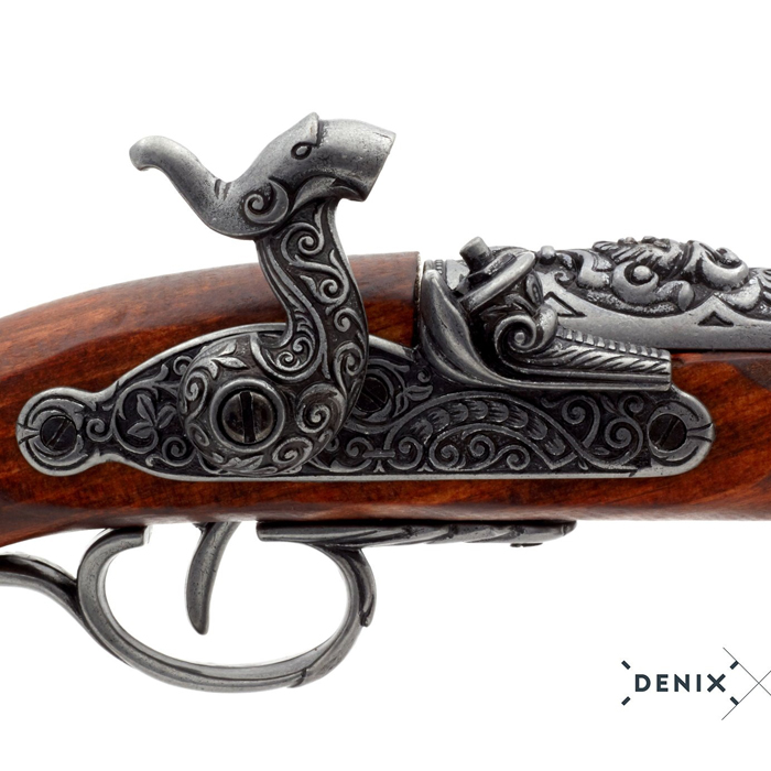 Denix présente un corps en bois verni solide et élégant, important pour l’aspect authentique recherché. Les pièces métalliques moulées offrent des détails précis, renforçant la sensation d’objet historique travaillé avec soin artisanal. Sa longueur totale de 37 centimètres permet une prise en main agréable, garantissant une présence visuelle remarquable sur une étagère thématique. Son poids de 629 grammes apporte de la densité, donnant une impression réaliste appréciée des collectionneurs et passionnés. Cette réplique est inspirée des armes utilisées par les pirates et corsaires naviguant les mers au XVIIIᵉ siècle. Ils voguaient entre batailles navales, abordages audacieux et quêtes de trésors interdites. Le pistolet évoque clairement l’imaginaire des flibustiers légendaires ayant marqué les récits maritimes populaires. Ainsi, cette pièce décorative devient un hommage visuel à ces aventuriers rebelles. Elle s’adresse aux collectionneurs cherchant une reproduction soignée, durable et réellement décorative.