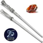 Pour célébrer les 25 ans du premier film Harry Potter à l’École des Sorciers, ce Coffret 25ans Harry Potter rend hommage aux débuts du sorcier le plus célèbre du cinéma. Il réunit deux baguettes emblématiques de Harry Potter et une reproduction de la mythique Pierre Philosophale. Chaque élément possède une finition argentée élégante et fidèle aux accessoires du film. Les baguettes mesurent respectivement 33 cm et 34,3 cm. La Pierre Philosophale est réalisée en résine translucide rouge. L’ensemble est présenté dans un coffret anniversaire élégant aux couleurs du Wizarding World. Ainsi, ce coffret devient immédiatement une pièce centrale dans une collection Harry Potter.