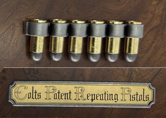 Erstens steht auf einer goldenen Plakette "Colts Patent Repeating Pistols", was an die Geschichte der von Samuel Colt signierten Schusswaffen aus dem 19. Jahrhundert erinnert.