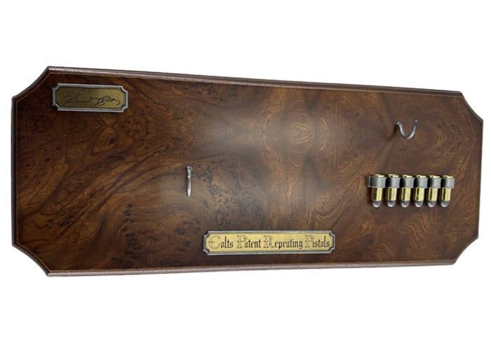 Stellen Sie Ihren Westernrevolver stilvoll zur Schau mit der Kolser-Wandhalterung aus edlem Holz, mit Haken, falschen Patronen und dekorativer Colt-Plakette.colt-1064