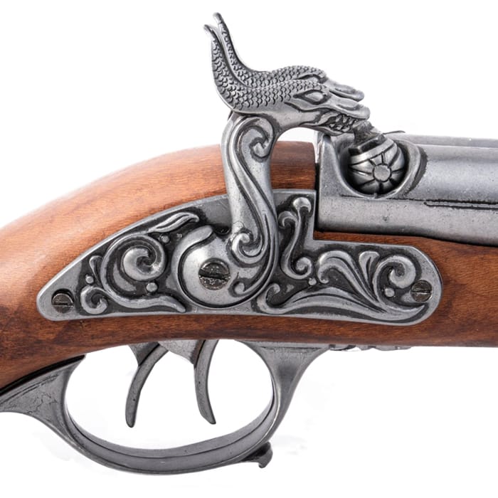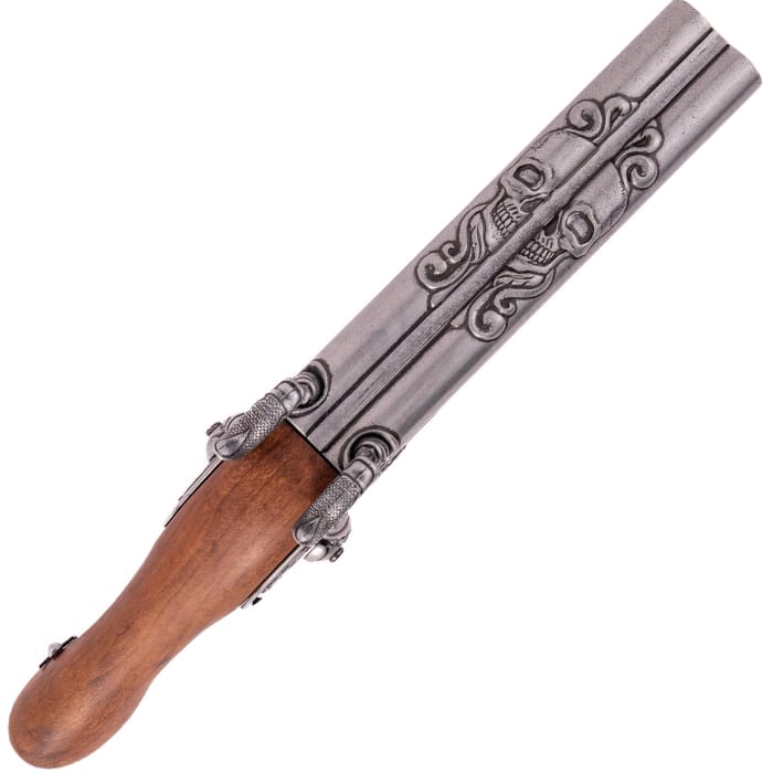 Wunderschöne Nachbildung einer doppelläufigen Piratenpistole, die vom 18. Jahrhundert inspiriert ist. Jahrhundert. Realistische Details, Vintage-Finish, Schießsimulation.