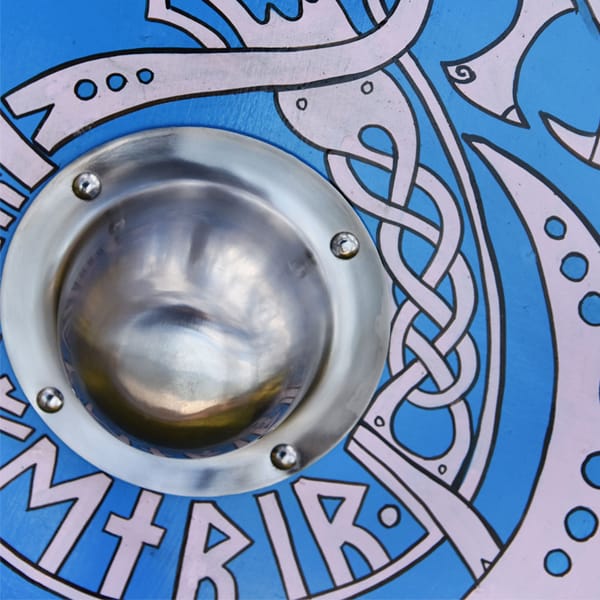 Zunächst einmal ist hier ein authentischer, dekorativer Wikingerschild, der mit dem mächtigen Fenrir-Wolf handbemalt wurde. In der nordischen Mythologie symbolisiert Fenrir die rohe Kraft und das unausweichliche Schicksal. Hergestellt aus 13 mm starkem, stabilem Sperrholz, das mit Leinen überzogen ist. Dieser Rundschild ist mit einem stilisierten, handgemalten Motiv des Fenris-Wolfs verziert. Außerdem ist er mit einer Runenfolge aus dem alten Futhark (dem ältesten Runenalphabet) versehen, die seinen Namen buchstabiert. Auf der Rückseite befindet sich ein Griff aus Massivholz, der gut in der Hand liegt. In der Mitte des Schildes befindet sich ein großzügig bemessener Stahlbuckel, der mit vier Nieten sicher an seinem Platz befestigt ist. Mit einem Durchmesser von 61 cm weist er eine realistische Größe für die Rekonstruktion oder Ausstellung auf. Die blaue Lackierung und die geflochtenen Wikingermotive verleihen ihm einen einzigartigen Stil.