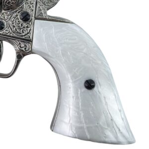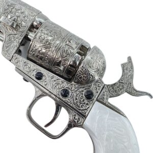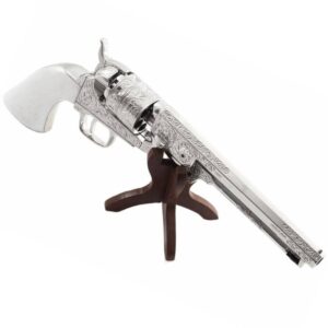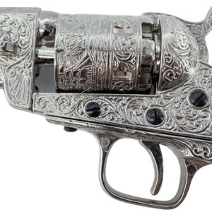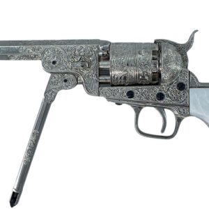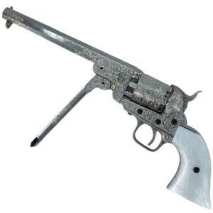 Un bel objet mais on voit tout de suite qu’il est faux : d’un sens qu’importe, le tout est qu’il représente le vrai aux niveaux détails, poids, prise en main, dimension. Après, les mauvaises langues ne manquent jamais. C’est vrai que la crosse fait très plastique sur ce modèle, ce qu’elle est d’ailleurs, et certains d’entre vous préféreront la version bois. Mais le vrai défaut vient d’une vis qui se desserre facilement, défavorable à la mécanique du tir. Le mécanisme, aussi, fait un bruit creux, mais peut-être est-ce dû à la crosse, creuse elle aussi… Sinon un bel objet de décoration, réplique exacte d’un de ceux que portait Wild Bill Hickock, une personnalité du far-west particulièrement réputée dans le domaine…