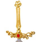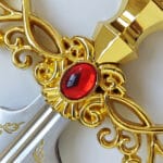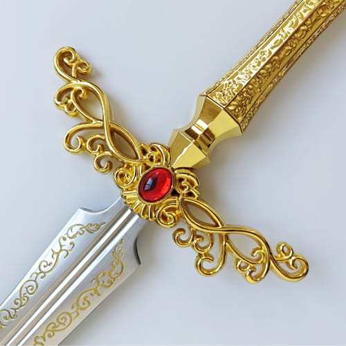 Tout d’abord, plongez dans l’univers d’Elden Ring avec cette superbe Rapière de Rogier. Une réplique fidèle à l’arme emblématique du célèbre mage épéiste. Conçue avec des matériaux de qualité, cette lame à gorge en acier inoxydable arbore des gravures minutieuses. Ajoutant ainsi une touche authentique et élégante. De plus, sa garde en acier doré lui confère une allure noble et majestueuse. Au centre de cette garde, vous retrouverez une pierre rouge en résine, élément distinctif qui sublime son esthétisme. Par ailleurs, sa poignée en acier plein doré est ornée de gravures sophistiquées. Offrant ainsi une finition digne des plus belles lames de l’univers d’Elden Ring. Son pommeau en acier doré, au design spécifique, apporte une touche finale harmonieuse. Pour compléter l’ensemble, cette rapière est livrée avec un fourreau en simili-cuir marron, accompagné d’un harnais permettant de la porter facilement.