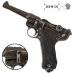 The Luger P08 from Denix is more than just a replica: it's a tribute to craftsmanship and history. Made from sturdy metal, it incorporates details faithful to the original, such as functional mechanisms that mimic those of the period. The hand-applied patina finish guarantees a realistic and unique appearance to each piece, evoking a weapon that has stood the test of time. This artisanal process ensures exceptional quality and incomparable realism. Choosing this replica means opting for an authentic object, ideal for historical re-enactments, collections or decoration. In conclusion, with Denix, you benefit from a product that combines historical accuracy, aesthetics and durability, so you can relive history in your own hands.