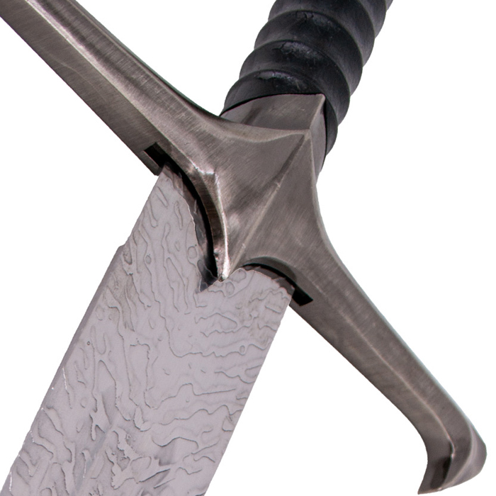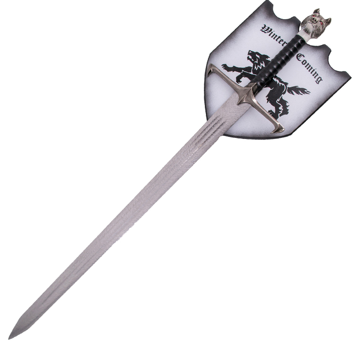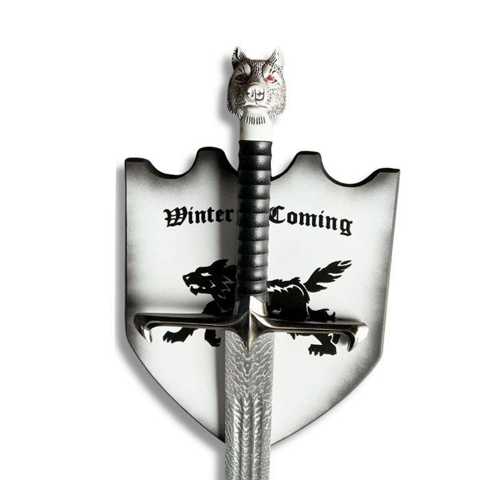 Tout d’abord, l’Epée Longclaw, une réplique d’exception tirée de la série Game of Thrones. Sa lame effet damassé lui confère un aspect authentique et raffiné. Le pommeau en tête de loup, sculpté en résine, symbolise la loyauté et la puissance de la maison Stark. Les yeux rouges du loup accentuent son allure féroce et majestueuse. Le support mural en bois, orné de l’emblème des Stark et de la devise Winter is Coming, complète parfaitement l’ensemble. Cette épée, une pièce de collection emblématique, fidèle à l’originale vue dans la série. Chaque détail, du motif de la lame à la garde métallique, reflète la noblesse et la force du Nord. Pour terminer, elle incarne à la fois l’élégance et la rudesse d’un monde où seule la loyauté assure la survie.