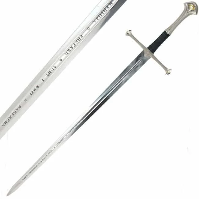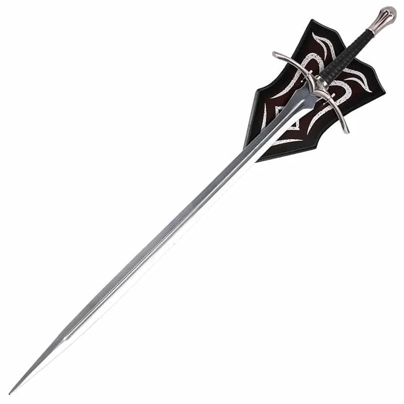 Andúril, la espada rota de Isildur, es sin duda la espada más emblemática de El Señor de los Anillos.. Forjada a partir de fragmentos de la espada Narsil, es entregada a Aragorn, heredero del trono de Gondor. Esta espada simboliza la legitimidad de Aragorn como rey y su destino.