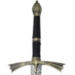 Tout d’abord, cette Épée Dark Sister Laiton est une réplique raffinée inspirée de l’arme mythique des Targaryen. Sa lame en acier présente un effet martelé qui rappelle le savoir-faire ancien des forgerons valyriens. La garde et le pommeau mêlent acier vieilli et laiton, offrant une esthétique noble et guerrière. La poignée métallique, enveloppée d’un fil coton noir, renforce la prise tout en respectant le style impérial de Westeros. De plus, l’épée est livrée avec un support mural orné du blason Targaryen. Grâce à cette présentation, chaque pièce devient un hommage aux dragons et à l’héritage des conquérants.