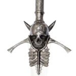Devil May Cry 5. È realizzato interamente in metallo, il che gli conferisce immediatamente una presenza imponente. La lama larga e massiccia rispetta le proporzioni iconiche del gioco. Ma sono i dettagli a spiccare. La guardia a 360° ha due forme distinte, a seconda dell'angolazione. Da un lato, una struttura demoniaca e aggressiva. Dall'altro, un design più organico e scolpito. Il teschio centrale e le corna rafforzano la sua identità infernale. Inoltre, il pomo testurizzato, visibile nelle foto, completa il pezzo con carattere. Infine, la spada viene fornita con un supporto da esposizione. Così potrete aggiungerla subito alla vostra collezione.