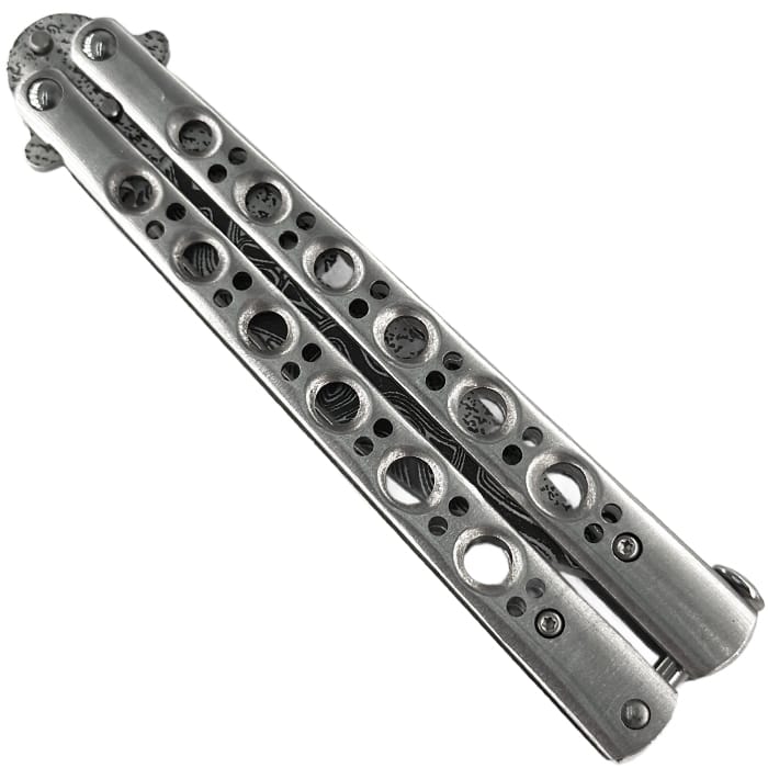 Innanzitutto, il coltello a farfalla SCK Damascus ha un aspetto autentico e metallico, con un sorprendente stile industriale.