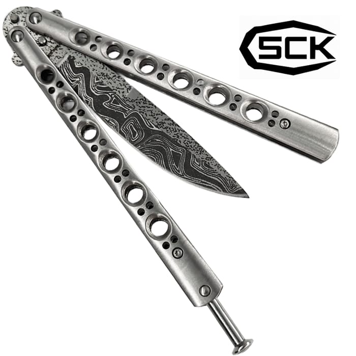 Il coltello a farfalla damascato SCK presenta una lama unica con un elegante motivo damascato stilizzato in un look di acciaio forgiato.