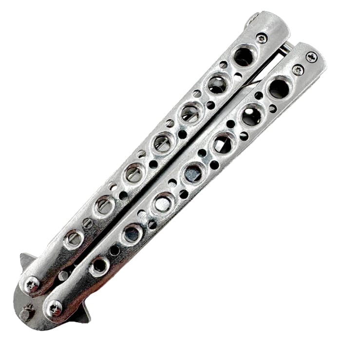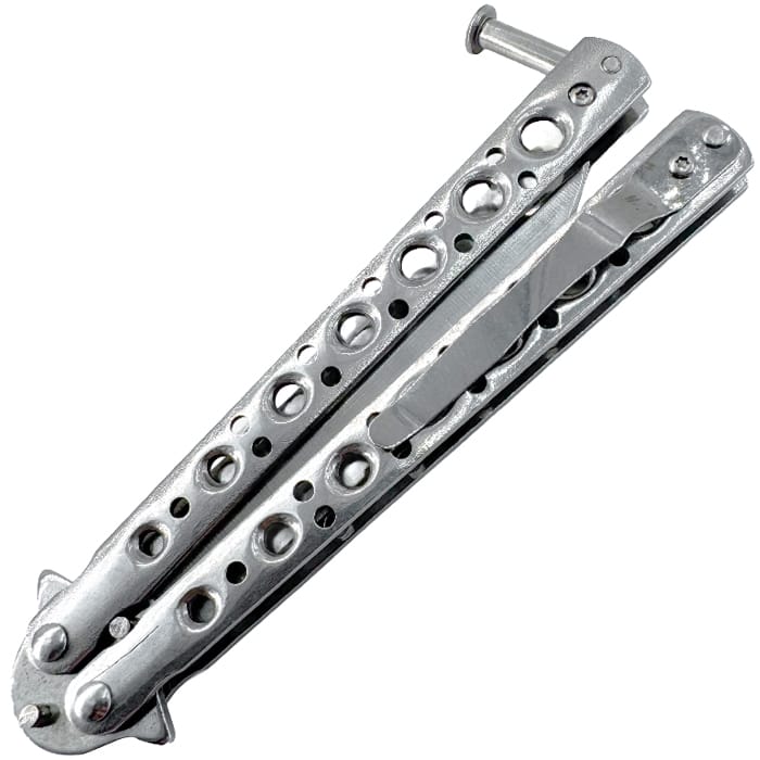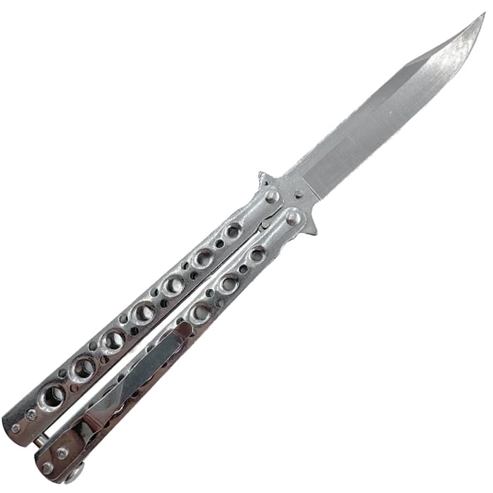 Iniziamo a dare un'occhiata a questo coltello a farfalla in metallo, che offre una presa stabile, un design accurato e una costruzione in acciaio inossidabile 100%. In primo luogo, la sua lama argentata è affilata ed elegantemente satinata, pensata per chi cerca precisione, equilibrio e una finitura professionale. In secondo luogo, i due manici sono traforati per alleggerire il peso complessivo e garantire un migliore controllo quando si eseguono trucchi o si manipola la lama. Infine, il coltello si chiude in modo sicuro con una classica chiusura che lo tiene saldamente in posizione quando è piegato. Una volta chiuso, è abbastanza compatto da poter essere facilmente infilato in una tasca o in un fodero per un trasporto senza ostacoli. La clip da cintura integrata lo rende sempre a portata di mano, senza intralciare i movimenti o appesantire l'attrezzatura. Ideale per esercitarsi nel flipping o per gli appassionati di lame in metallo belle e ben bilanciate. Lo stile industriale grezzo e la finitura interamente argentata di questo modello sono perfetti per i collezionisti più esigenti.