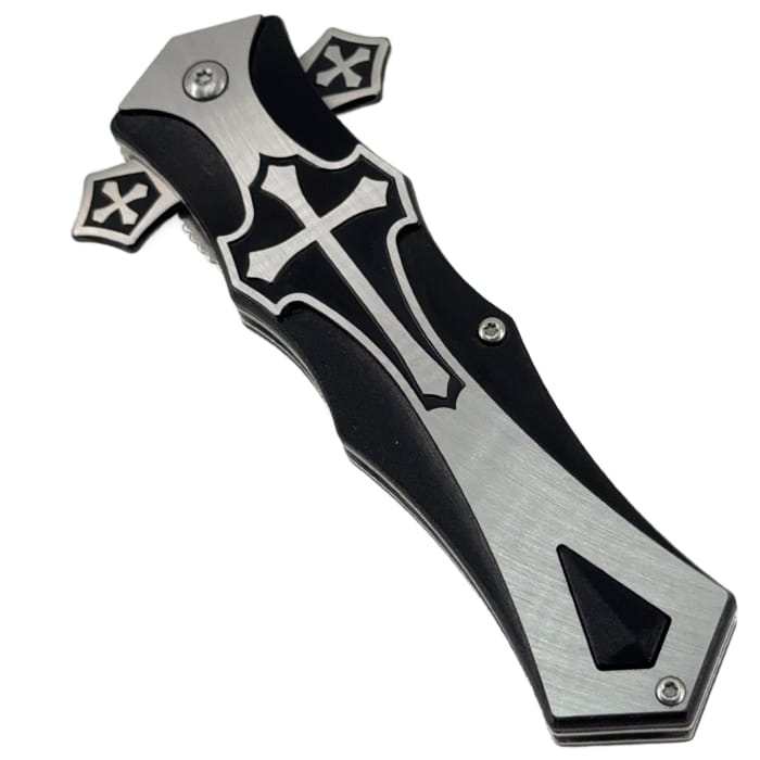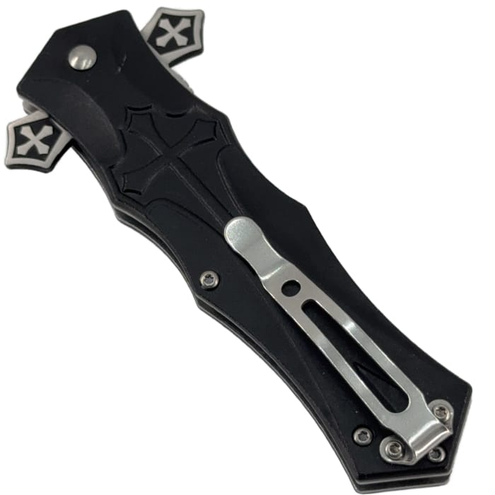 Iniziamo a esaminare il coltello pieghevole Templar Black and Silver, ornato da una maestosa croce templare incisa nel cuore della sua elegante impugnatura.
