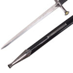 Prima di tutto, questo Pugnale Anduril è un'elegante interpretazione della leggendaria spada del Re Elessar. La lama in acciaio è finemente incisa con motivi elfici ispirati alla Terra di Mezzo. La guardia e il pomo in acciaio massiccio aggiungono forza ed equilibrio. Inoltre, il fodero è realizzato in ABS stampato di alta qualità e presenta una decorazione meticolosa in linea con l'estetica elfica. In breve, questo pugnale unisce finezza, simbolismo e maestria. Le sue dimensioni compatte lo rendono ideale per essere esposto o collezionato. Il risultato è che questo pezzo diventa un oggetto originale, pur conservando l'aura mitica di Andúril.