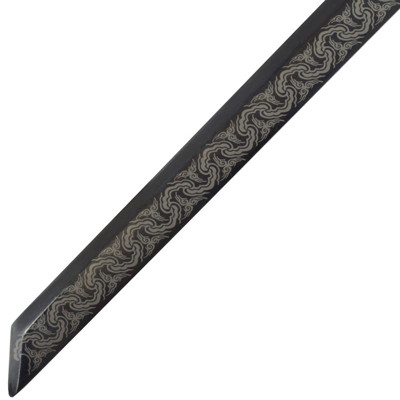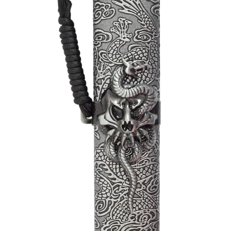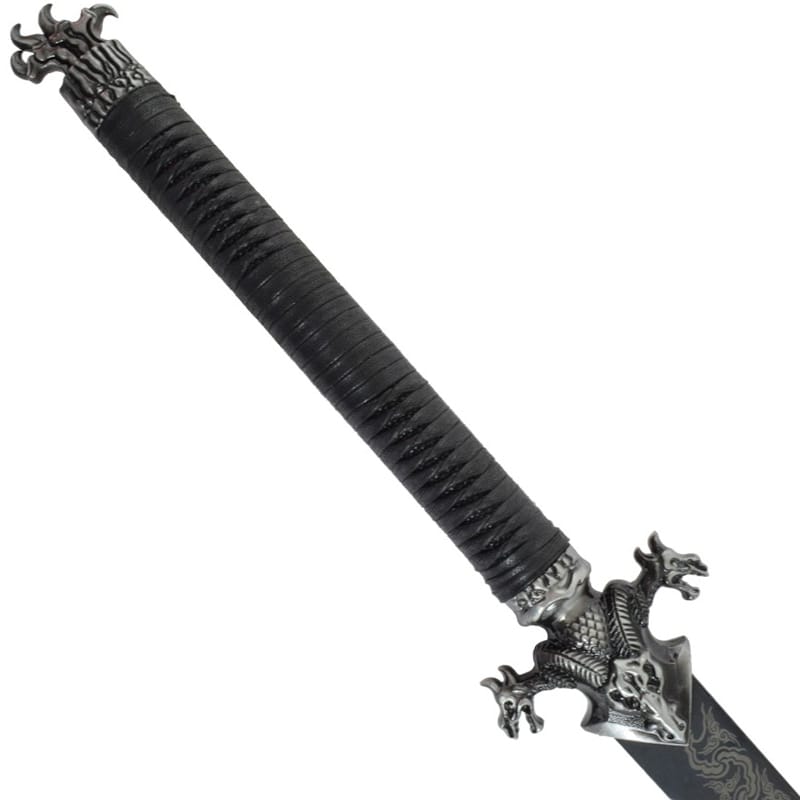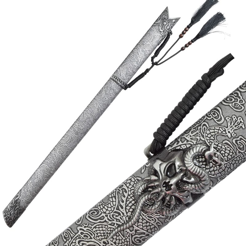 Pour commencer, imaginez un général de l’empire Tang marchant avec assurance dans les couloirs du palais royal. À sa ceinture, l’arme des hautes sphères militaires : une épée droite, redoutable et raffinée. Gravée de motifs élégants, cette épée marie l’esthétique à la performance. Elle évoque également, les duels d’honneur, les parades militaires et la discipline martiale d’une époque prestigieuse. Design fidèle à l’imaginaire des généraux de l’époque Tang avec sa garde en acier massif vieilli, ornée de deux têtes de dragon entrelacées, incarne parfaitement la symbolique impériale. Le fourreau en bois, habillé d’un tissu épais décoré de dragons traditionnels, complète cette pièce d’exception.  Par ailleurs, à ses extrémités et en son centre : des pièces métalliques finement sculptées. Ainsi que le cordage noir, orné de deux pompons avec perles en bois, ajoute une touche cérémonielle et authentique.