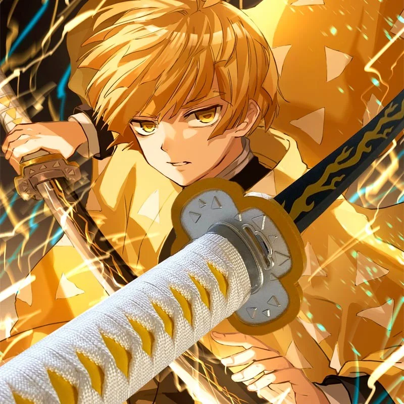 Zenitsu Agatsuma, au départ un personnage timide et craintif, porte un katana forgé spécifiquement pour son utilisation de la respiration de l’éclair. Ce katana, bien que simple en apparence, est le moyen qui permet à Zenitsu de déployer toute sa puissance lorsqu’il est poussé par le désespoir.