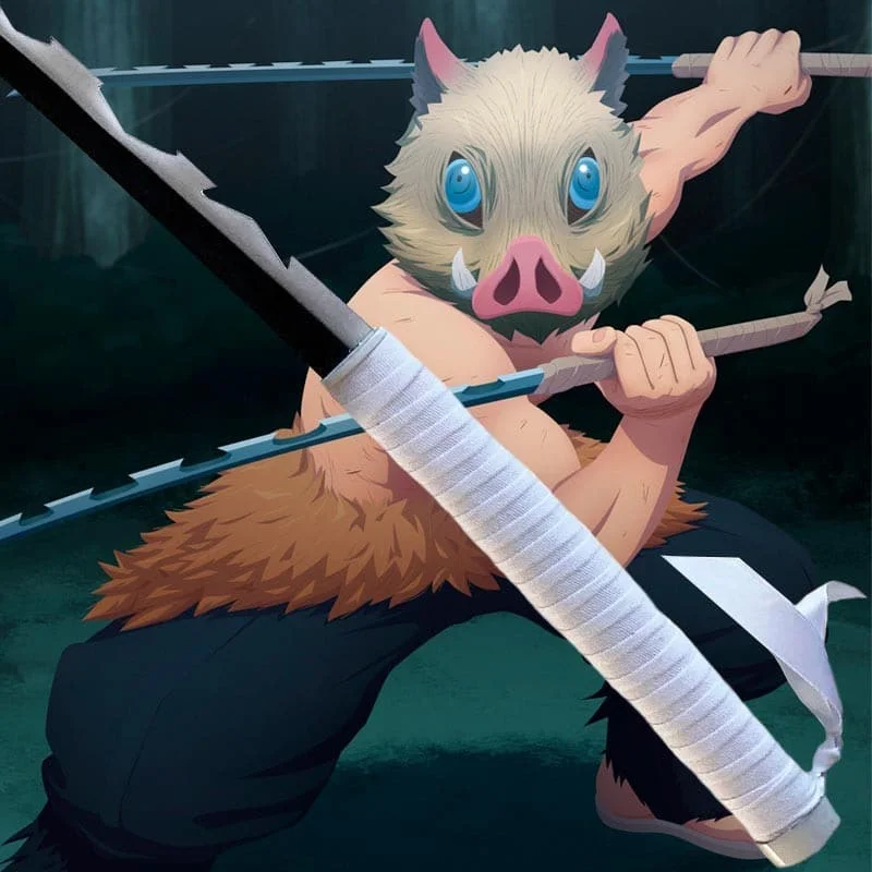 Inosuke Hashibira, élevé par des sangliers et doté d’une personnalité sauvage, porte un katana forgé à sa manière. Il est bien différent des autres katanas dans Demon Slayer, car Inosuke manie deux épées au lieu d’une.