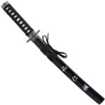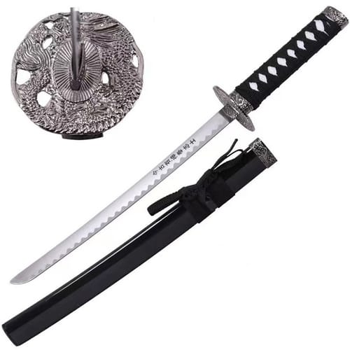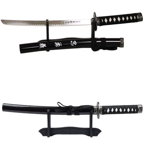 Poignée soigneusement recouverte d’une tresse en coton noir, très agréable en main. Sa garde en métal complète un design soigné et très fidèle au film. Le fourreau noir laqué, décoré d’un insigne japonais, ajoute une touche traditionnelle. Livré avec un support en ABS pour une présentation facile et élégante. Avec 27 cm de lame et 45 cm au total, il s’expose partout avec style.