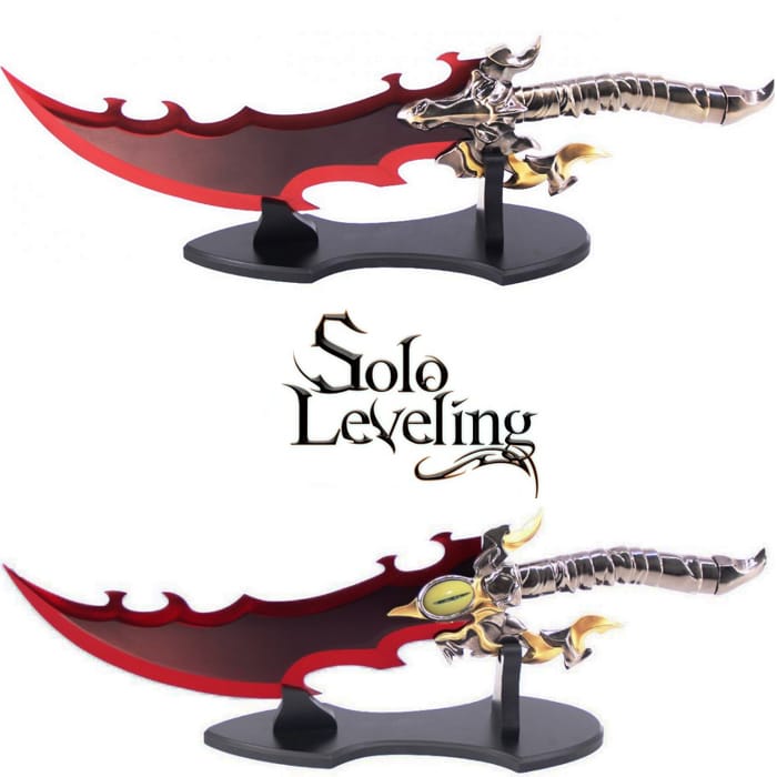 Deux Dagues du Roi Démon dans Solo Leveling. L’une arbore une garde en tête démoniaque, l’autre un œil terrifiant. Ensemble, elles forment un duo redoutable et spectaculaire. D’ailleurs, chaque détail est travaillé avec soin pour un rendu fidèle et puissant. Ces deux armes incarnent l’essence sombre et maléfique du personnage. Parfaites pour enrichir une collection dédiée à Solo Leveling. Grâce à leur complémentarité, elles deviennent un atout décoratif unique. En conclusion, cette promotion exclusive permet de réunir les deux versions en une seule acquisition.